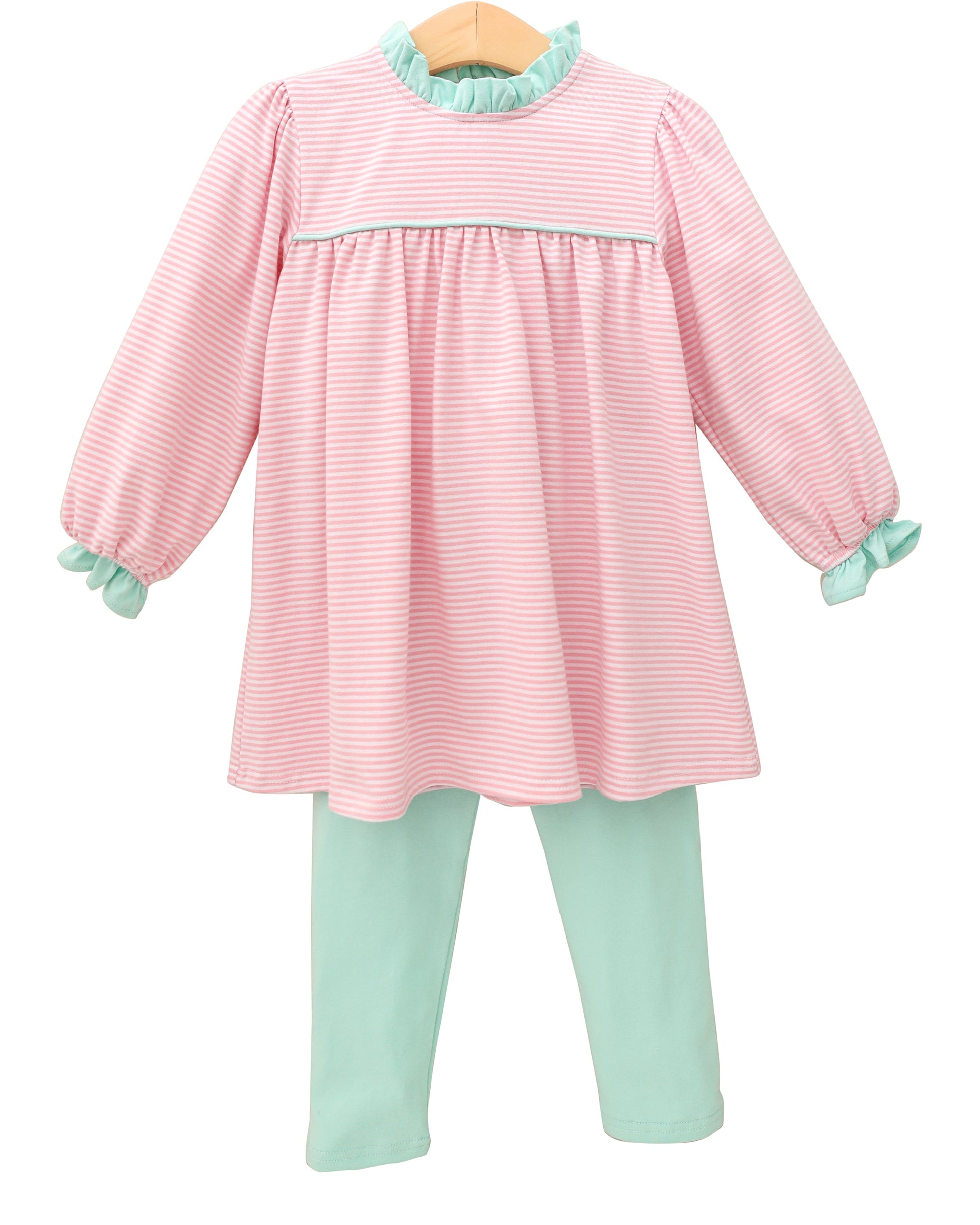 Cotton Knit legging set Tiny pink stripe trimmed in Mint Green, coordinating Mint Leggings