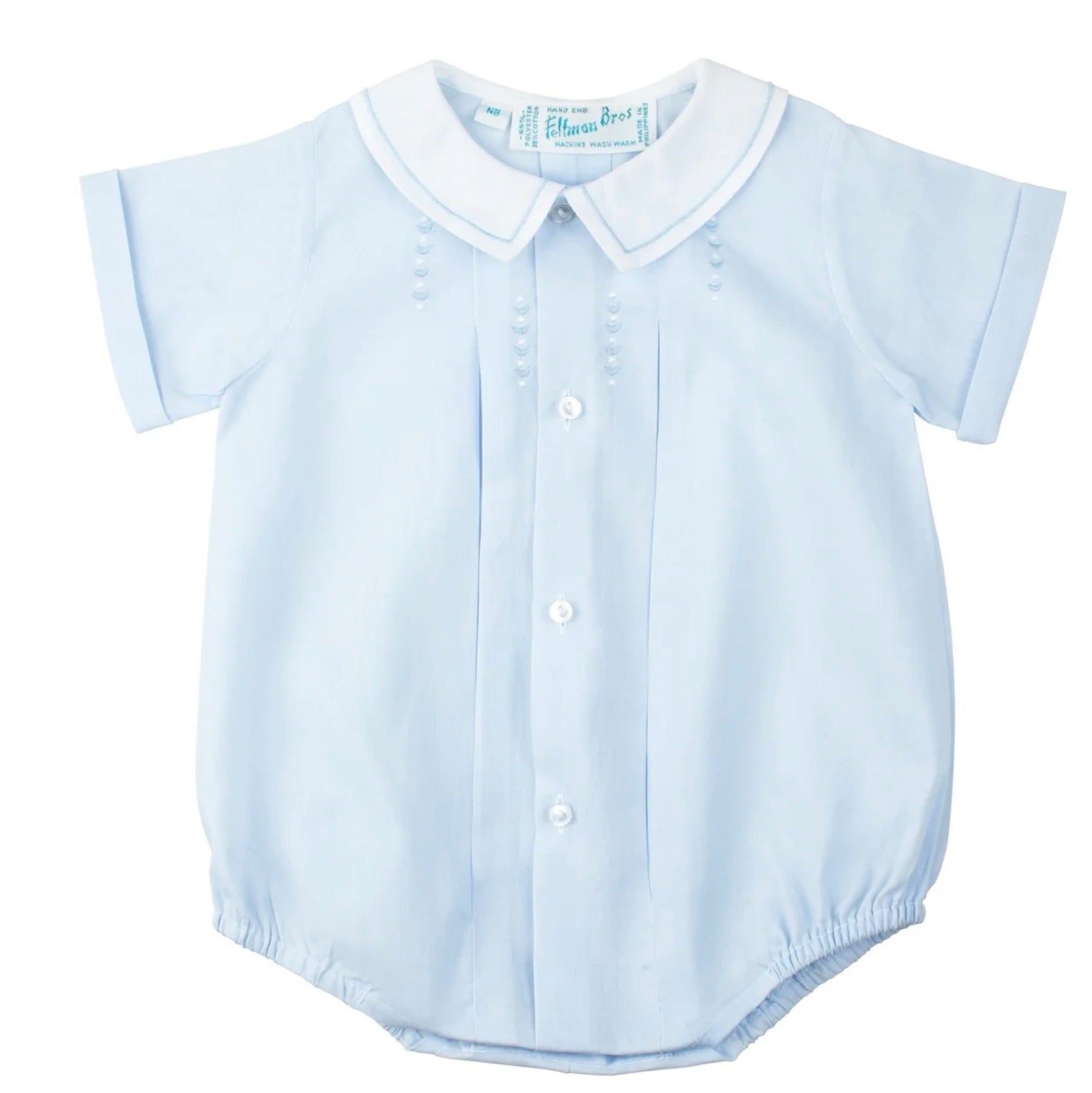 A beautifully detailed creeper, for little boys who deserve only the best. This infant outfit is a classic of understated elegance with its dainty hand embroidery on the bodice beside two inverted pleats going down the front. A white collar with blue stitching finishes off the look.