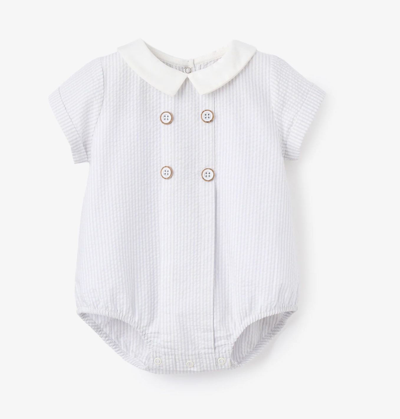Simple, sweet, and endlessly versatile, this button front bubble features classic blue seersucker with a clean, tailored silhouette. An easy favorite for warm weather days and milestone moments alike.