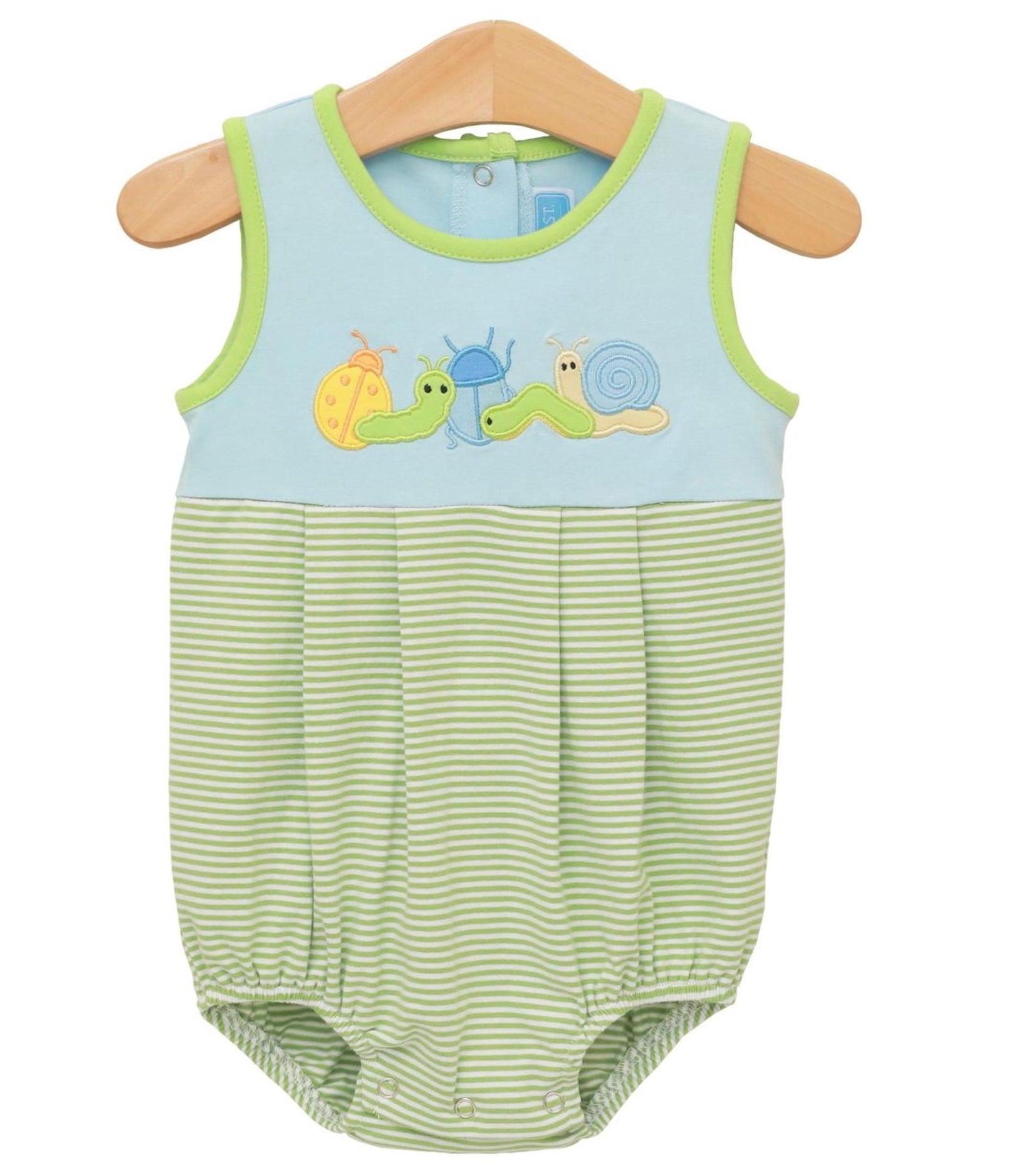 Buggin' Around Bubble features a charming green and white striped knit body with an adorable blue yoke adorned with appliqued bug details. Designed for active little ones, the crotch snaps ensure easy diaper changes and secure fit during playtime. The soft knit construction offers comfort and flexibility, while the playful bug motif adds personality to everyday wear.
