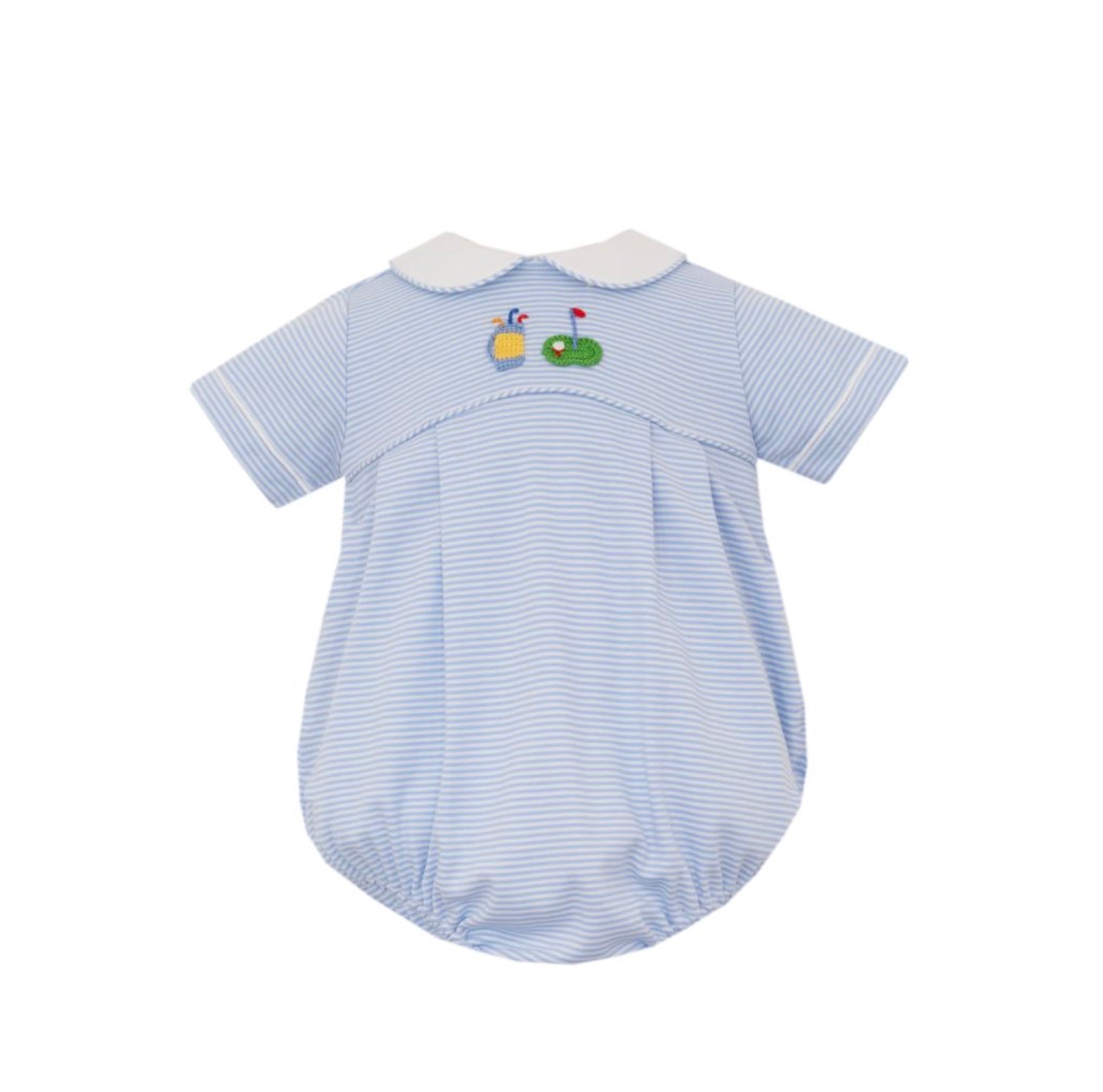 This charming golf bubble features a classic blue and white gingham pattern, accented with a crisp white Peter Pan collar for a timeless look. The yoke is beautifully detailed with a crocheted golf bag and green motif, adding a playful touch. Designed with care, it offers both style and comfort for your little one on the green.