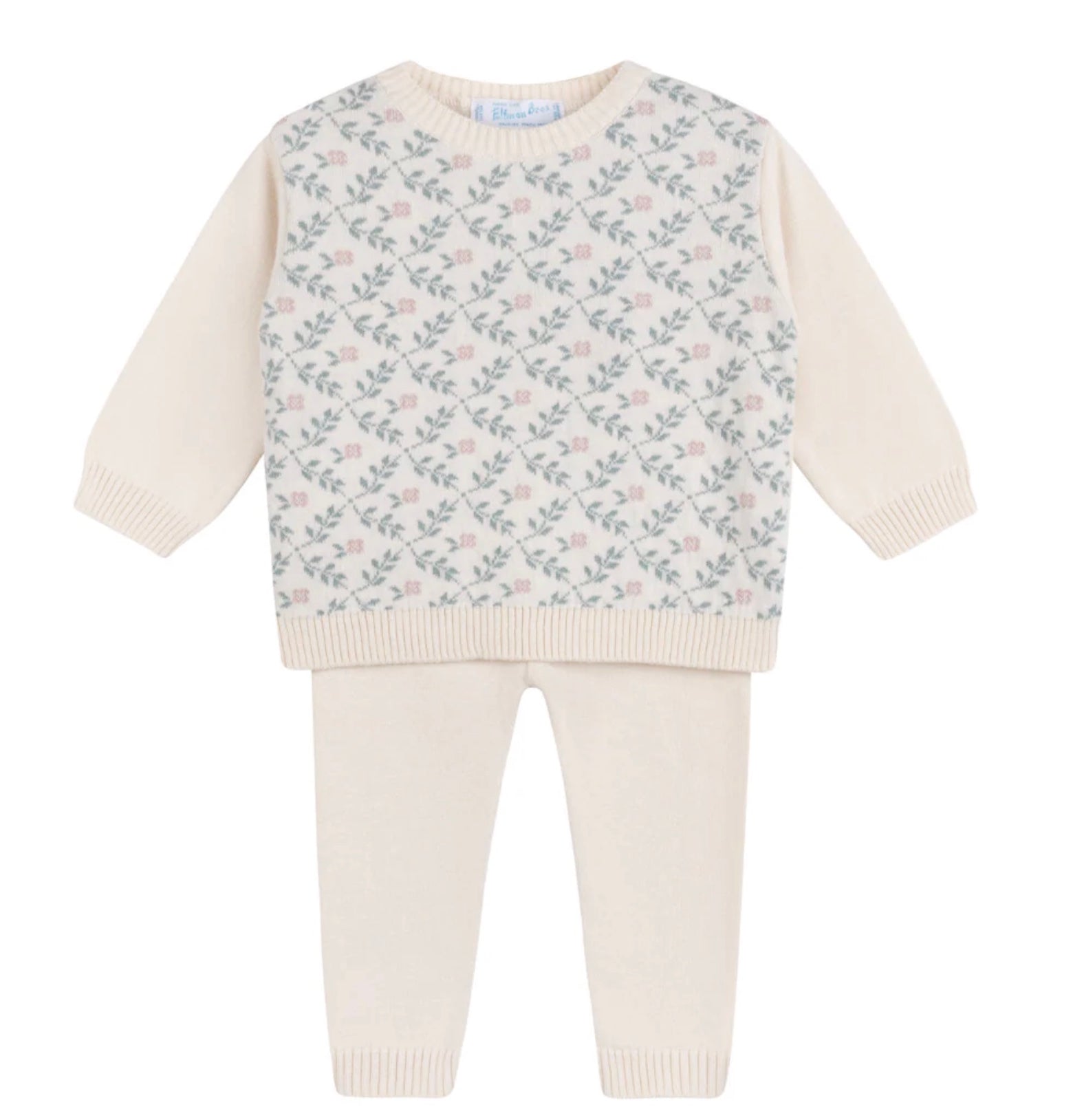 Looking for that special outfit for your loved one this season? Look no further than this classic knit set, with its cozy feel and vintage style. Available in Navy and Ecru with mauve and sage colored floral vine details.