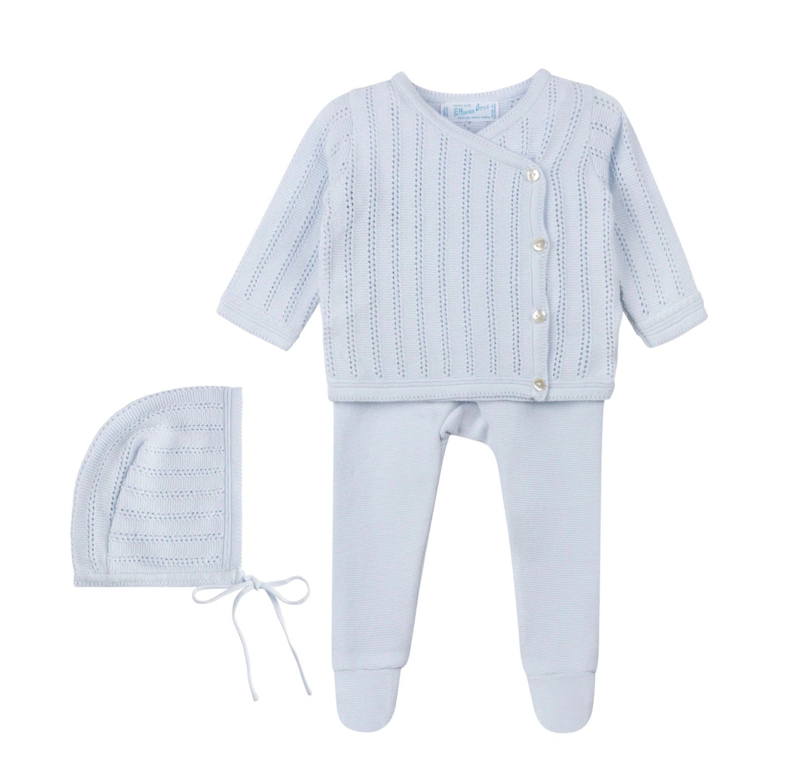 A timeless, vintage style knit set for your baby. This 3-piece set features a classic pointelle design for an heirloom style - great as a take-me-home outfit, gift set, or for special occasions.