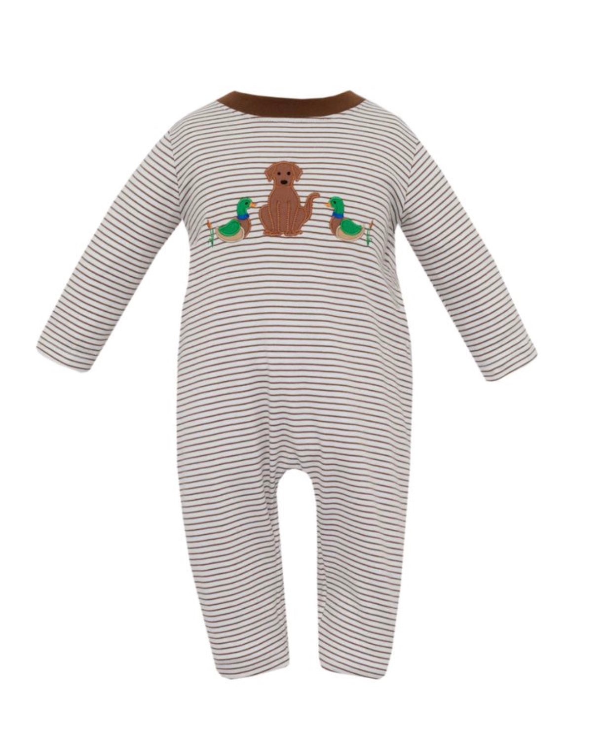 HUNTING LAB- Brown knit stripe boys long romper.