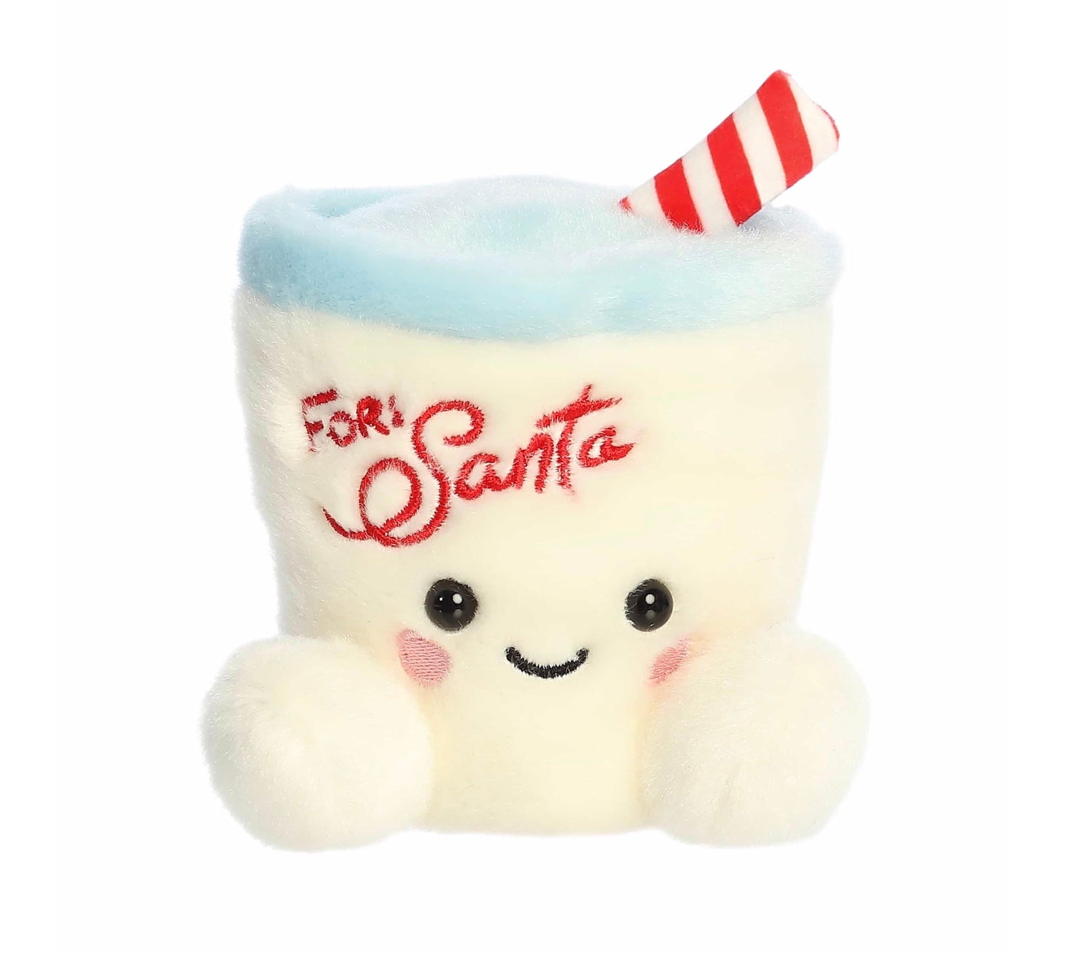 Kris is a white plush glass of milk with a sky-blue rim, candy-striped straw, and “For Santa” embroidered in red script. Her sweet face and cozy cup shape give her just enough innocence to hide all her playful plotting.