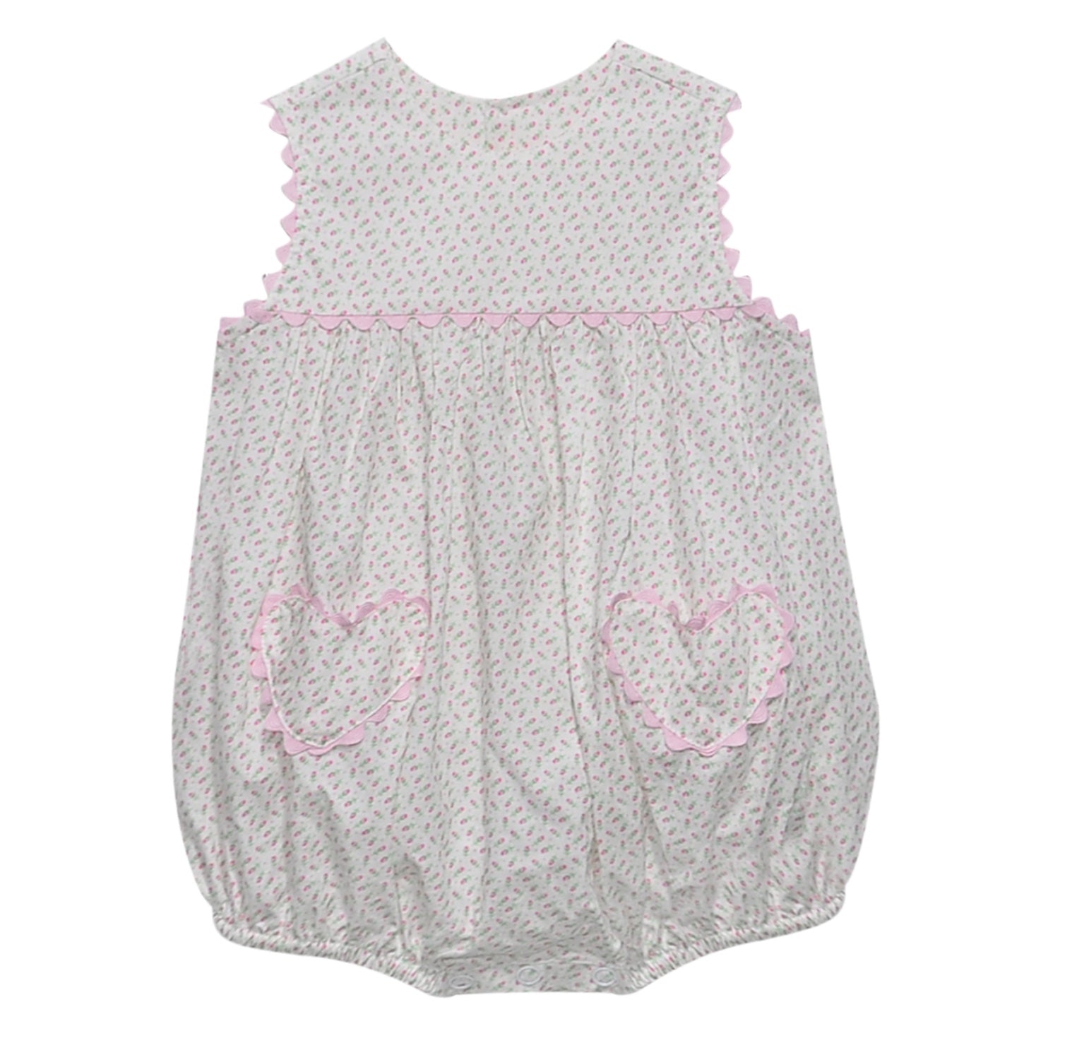 Delicate rosebud print meets playful design in this charming bubble romper. Soft pink fabric is trimmed with vintage-inspired ric rack edging, while heart-shaped pockets add whimsical detail. Convenient snap closures at the crotch make diaper changes effortless. Perfect for gift-giving or everyday wear, this piece combines heirloom-quality aesthetics with practical functionality for little ones.