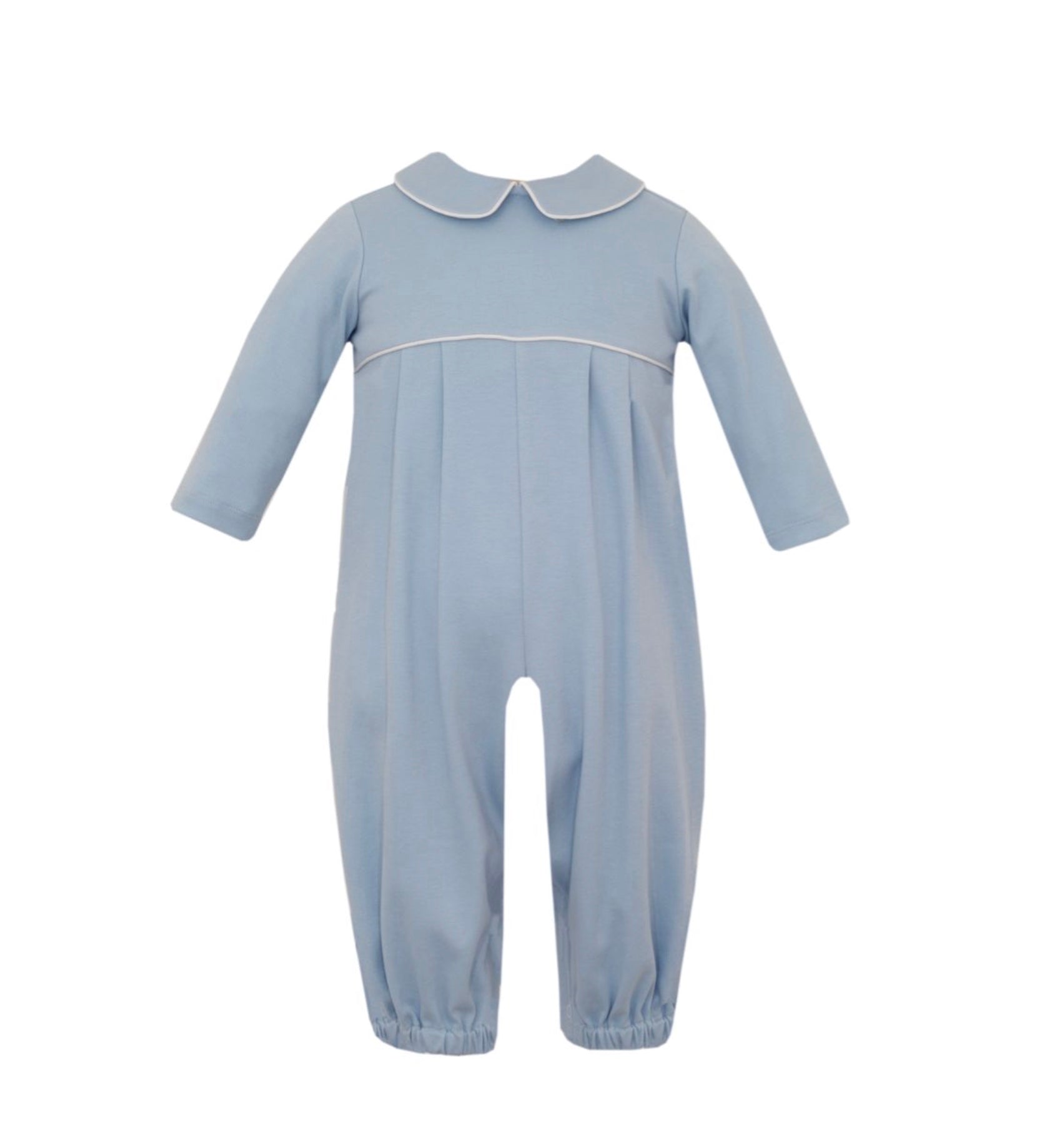 Luke's Blue Knit Romper offers cozy comfort with its soft blue knit fabric and subtle white piping for a classic touch. Designed with long sleeves and elasticized leg openings, it ensures a snug fit that moves with you. Perfect for layering or wearing on its own, this romper combines ease and style for everyday wear.