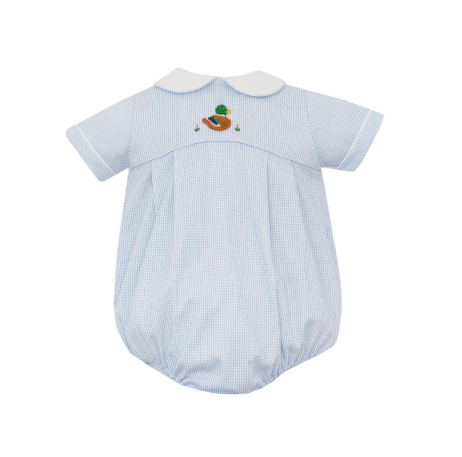 This expertly crafted blue gingham check bubble features a crisp white Peter Pan collar for a timeless look. The yoke is beautifully detailed with a charming crocheted mallard, adding a refined and whimsical accent. Ideal for both special occasions and everyday wear, this piece blends classic style with delicate touches.