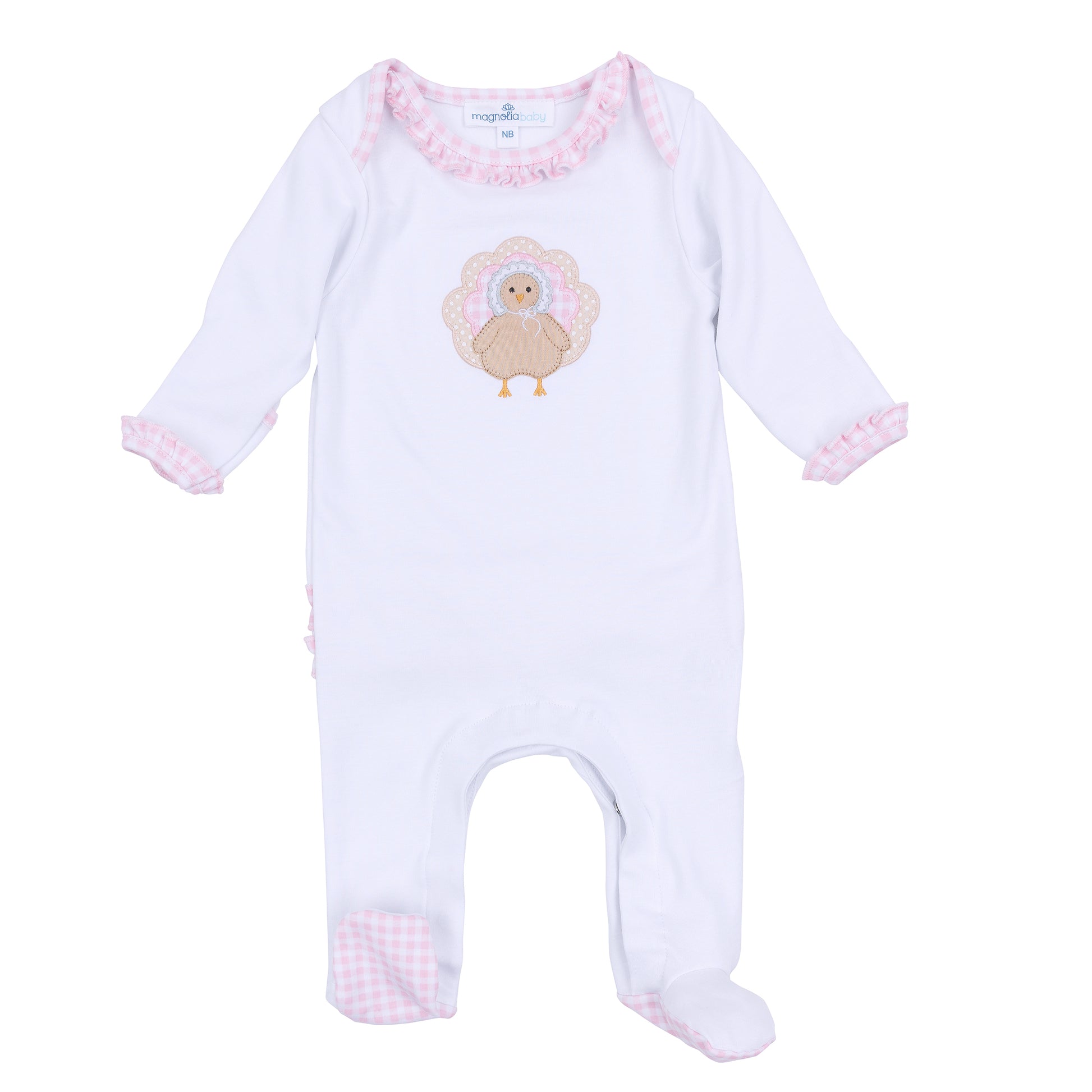 Turkey Appliqué Footie With Pink Gingham Check Trim,