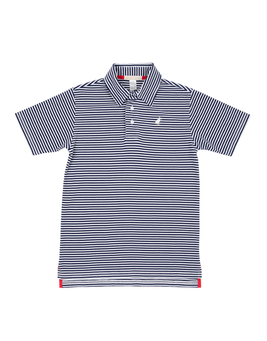 Beaufort Bonnet Co. striped polo w/ multi color stork logo, Nantucket Navy stripe