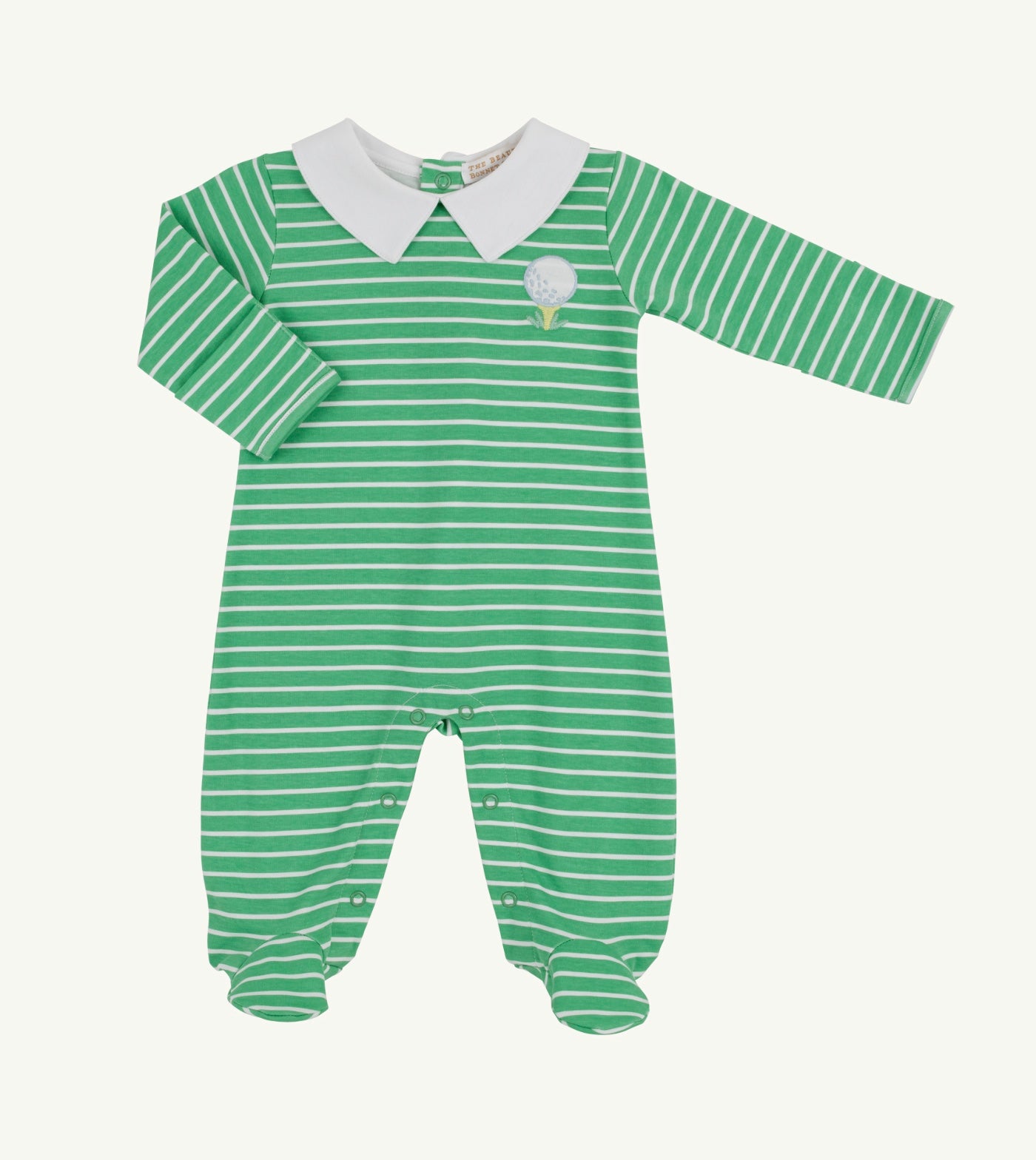 Tee up style with our Rock Me Romper featuring sophisticated Gibson Island Green Stripe beautifully accented with Worth Avenue White trim and charming golf embroidery. Crafted from premium fabric with a classic silhouette, convenient snap closures, and thoughtful details, this versatile one-piece is perfect for special occasions, family outings, and creating picture-perfect moments. A wardrobe essential that brings sporty sophistication and comfortable wearability to every celebration.