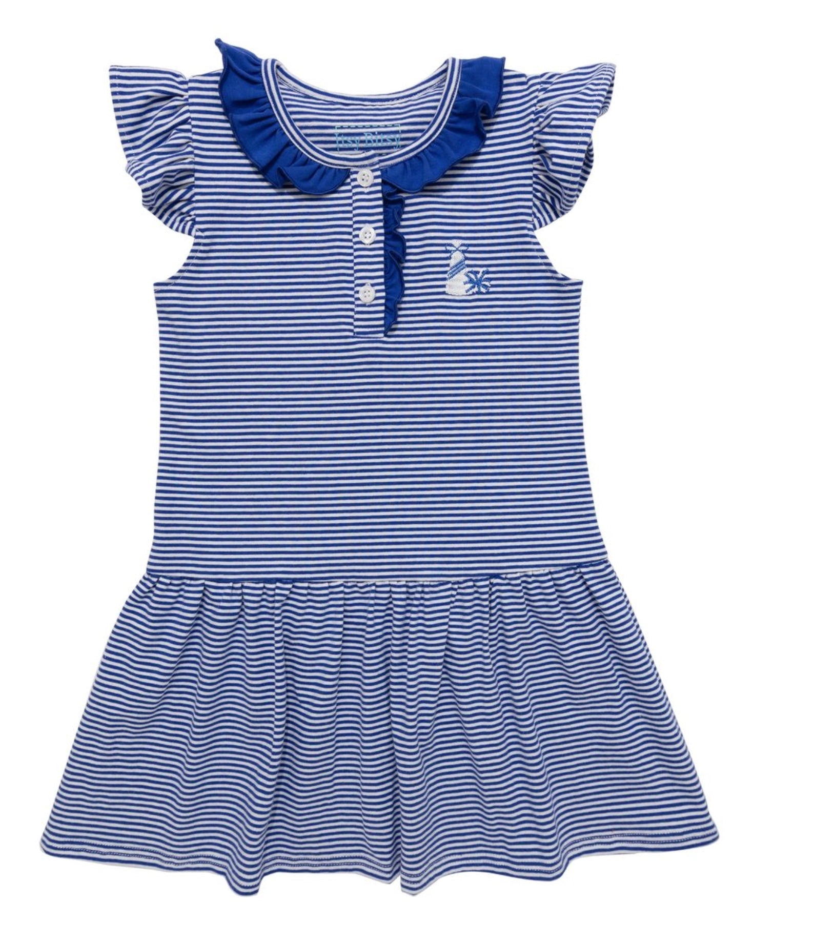 This Royal Ruffle Cheer Dress features a charming blue and white striped dropped waist design, accented with embroidered cheer megaphone and pom pom details. Its playful style celebrates team spirit while offering comfortable wear, perfect for showing support with a touch of fun and flair.