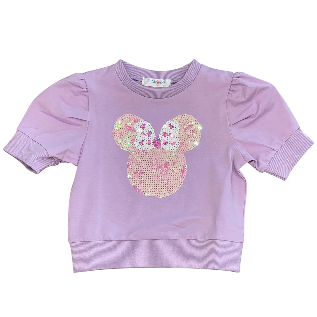 Lulu Bebe Adorable Top Lavender Sequin Minnie Mouse With Puffed Elbow Length Sleeve.