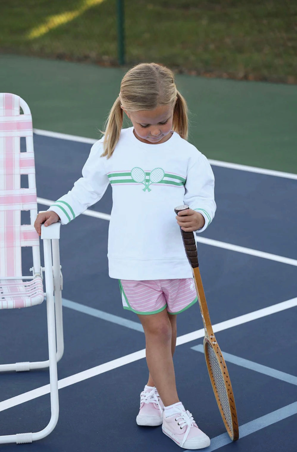 Let her move in style with our Prepletic™ Shimmy Shake Shorts featuring beautiful Pier Party Pink Stripe accented with Gibson Island Green, designed for active days and warm-weather adventures. Crafted from premium performance fabric with a comfortable fit and thoughtful details, these versatile shorts are perfect for the tennis court, playdates, and casual outings. A warm-weather essential that brings sporty sophistication and all-day comfort to her spring and summer wardrobe.
