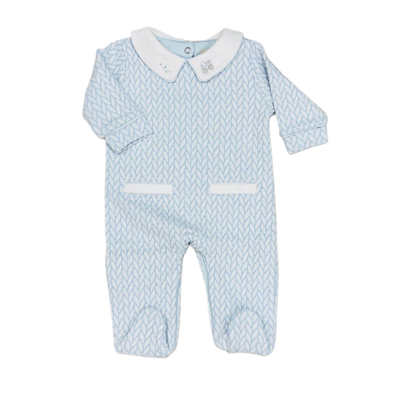 Quilted Braided 55% Pima Cotton/45% Nylon Knit Footie with Train embroidery on collar