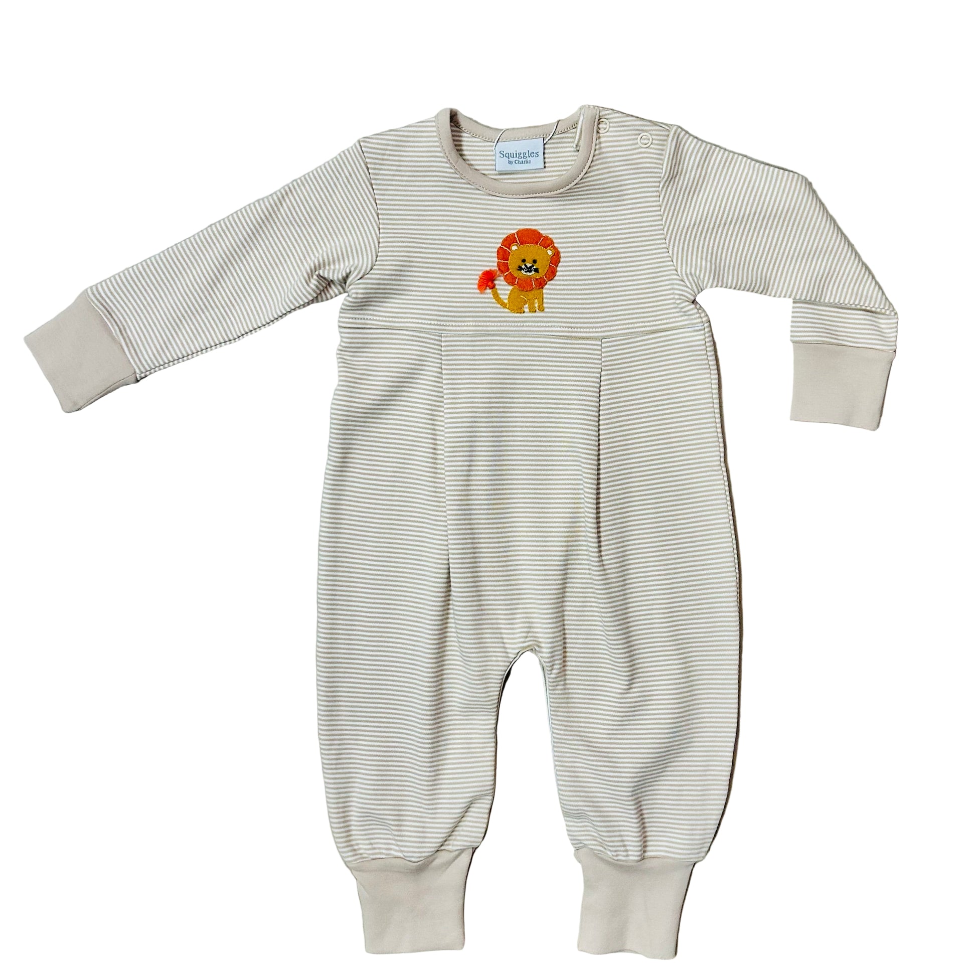This sand-colored stripe romper features a charming hand-stitched felt applique of Leo the Lion on the yoke, adding a unique, artisan touch. Designed for convenience, it includes snaps in the crotch for easy diaper changes, making it both stylish and practical for everyday wear.