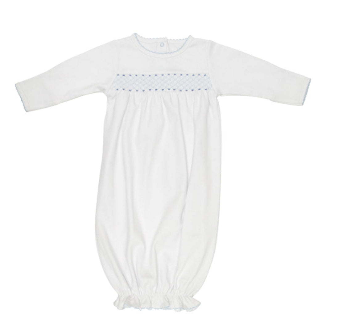 The Sweetly Smocked Greeting Gown is the perfect day gown from the stunning blue smocking details to the sweet sleeve details, this gown is a necessity for your little one !