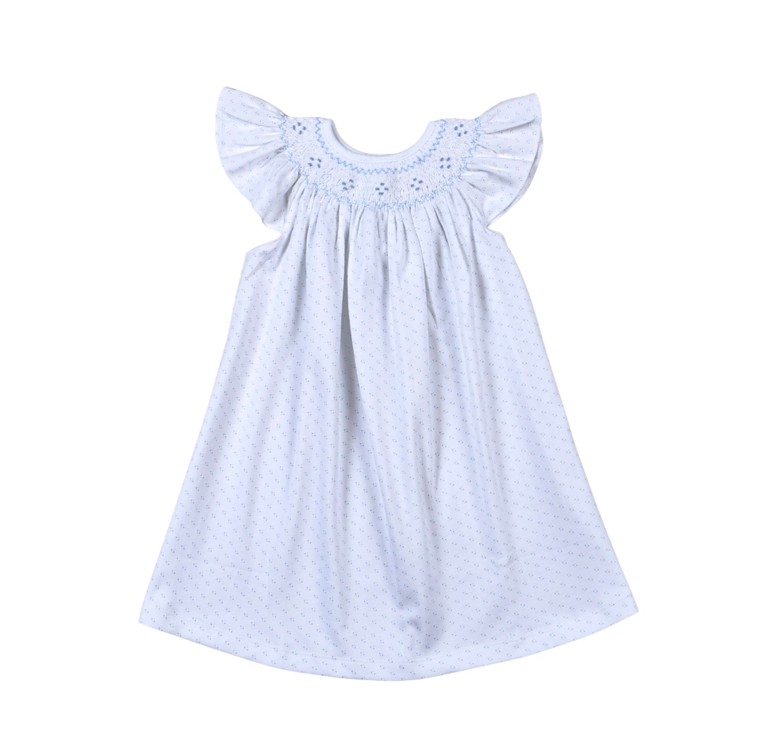 Blue and white polka dot bishop dress, smocked with geometrics and bullions