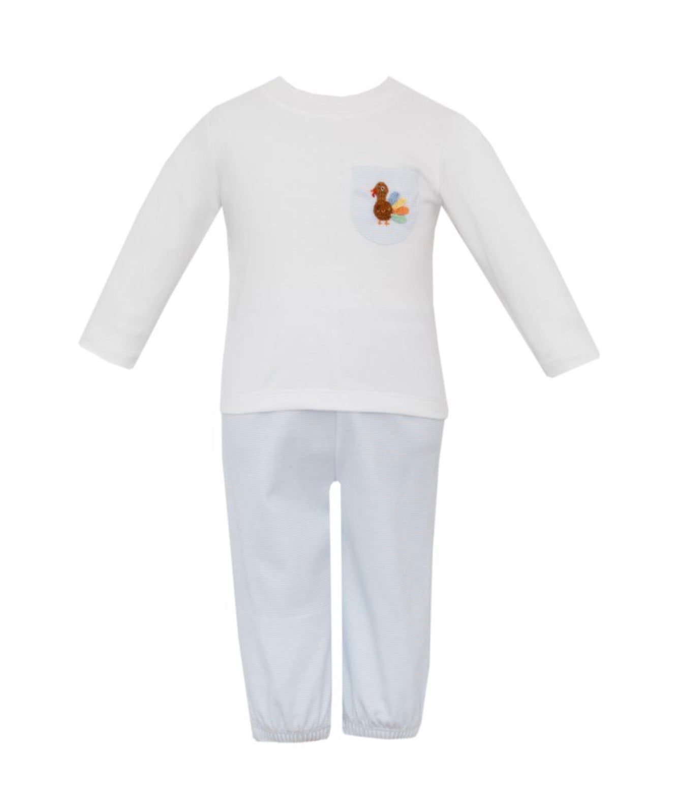 This Tommy's Turkey Pant Set features expertly crafted knit pants in a classic blue stripe pattern, paired with a coordinating top adorned with a vibrant, colorful crocheted turkey on the pocket. The detailed crochet work adds a unique, artisanal touch, while the soft knit fabric ensures comfort and durability. Ideal for those seeking a blend of playful design and quality craftsmanship in children's apparel.